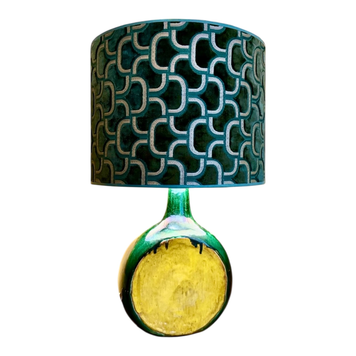 Een unieke vondst uit de jaren ‘70 met een brutalistische, ruige charme. De vaasachtige lampenvoet combineert diep groen met warm okergeel, een kleurcombinatie die direct sfeer en karakter toevoegt aan elk interieur.