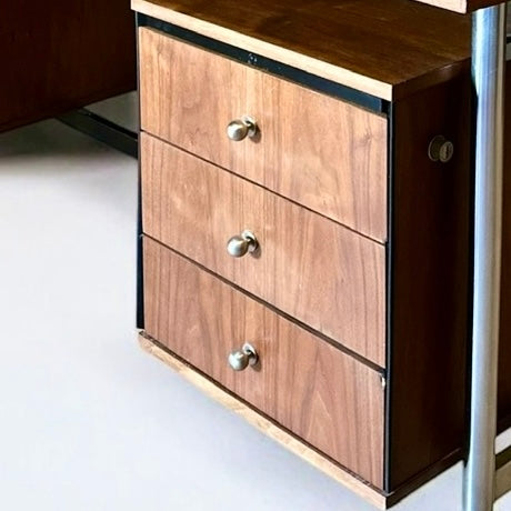 Dit exemplaar heeft een rechthoekig blad van gelamineerd palissanderhout, gedragen door een frame van verchroomd staal. De twee ladeblokken zijn uitgevoerd in licht hout en voorzien van de originele, karakteristieke Wabbes-handgrepen. Het ontwerp weerspiegelt de minimalistische, industriële esthetiek van de mid-century modernistische stijl.